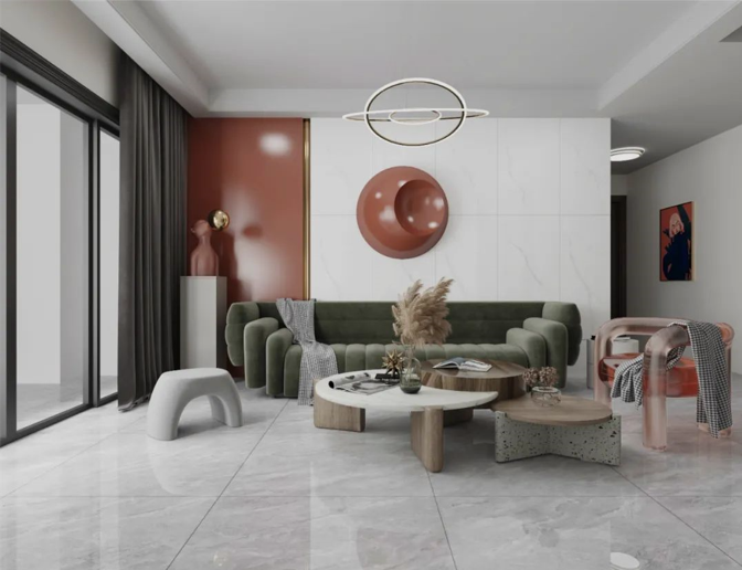 地面以哥特石作為延伸,粉色系猶如客廳的點睛之筆,在極簡燈具的照射下,營造出甜美浪漫、溫馨優雅的氛圍。家具和軟裝布置通過木色、白色和墨綠色的相互結合,回歸原始狀態,盡顯少女甜蜜。