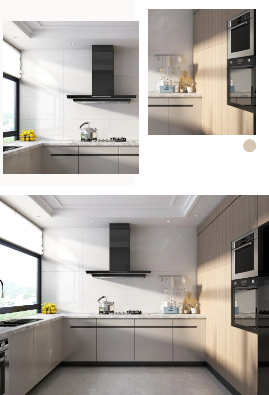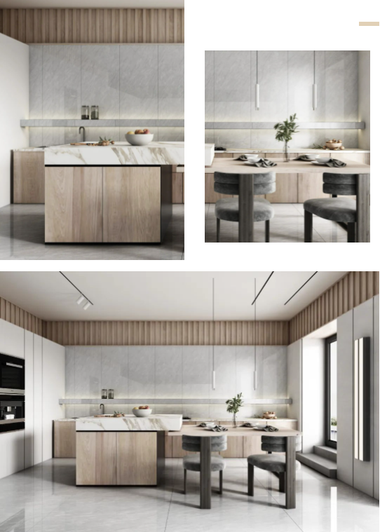 墻面通體瓷拋石中板馬特拉,清爽的色調(diào)既拓寬了廚房的空間感,一石多面又增添了些許靈動,在陽光照射下,與暖調(diào)木紋互相輝映,建立起空間與自然之間的聯(lián)系,讓每次下廚都成為期待。