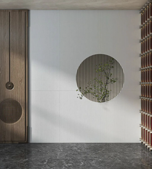 墻面選用750X1500mm規(guī)格的宋素|凡古磚綺羅香,整體基調(diào)偏向淺色系,搭配原木色等主體色,仿佛呼吸著大自然的氣息,領(lǐng)悟塵世喧囂中的靜謐。